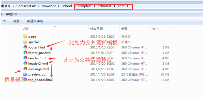进入template---school01模板里面,core是核心模块模板文件夹,里面有主要存放公共头部和尾部,这个得记住。头尾部就是存放在此的。